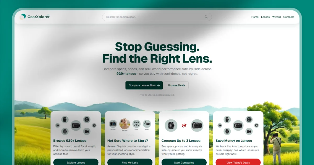 GearXplorer helps photographers and content creators compare camera lenses and action cameras side by side — so you spend less time researching and more time shooting.
